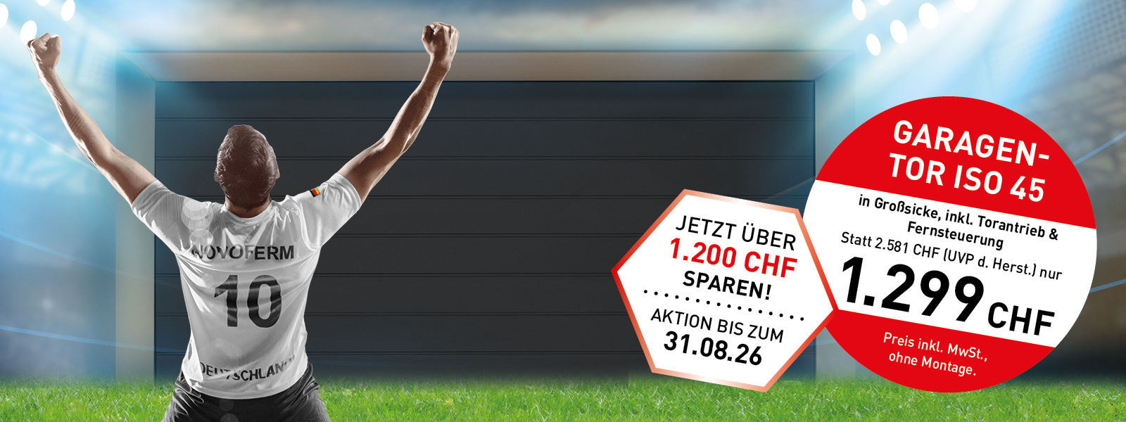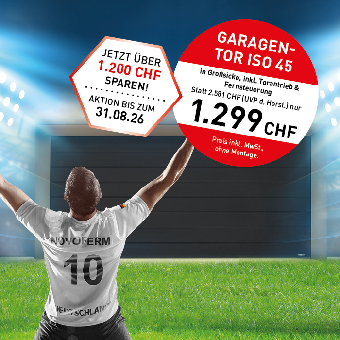 Erleben Sie größte Vielfalt, bestmöglichen Komfort, höchste Sicherheit und neu besonders hoher Wärmedämmung mit Premium-Sektionaltoren mit 45 mm Dämmung! Bis zum 31.08.2026 zum attraktiven Aktionspreis von nur 1.299,- CHF exkl. MwSt., (ohne Montage) / statt 2.581,- CHF (UVP des Herstellers)!